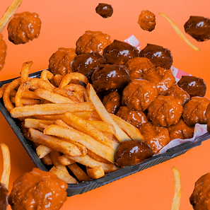 300gr. de papas + pollo crujiente en trozoz + Queso cheddar + tus aderezos y salsas favoritas
